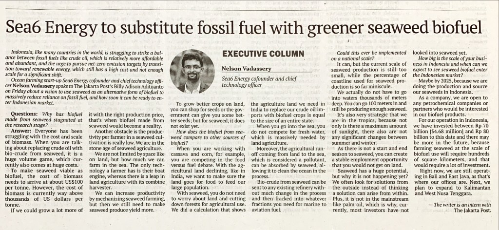 Executive Column: Sea6 Energy to substitute fossil fuel with greener seaweed biofuel